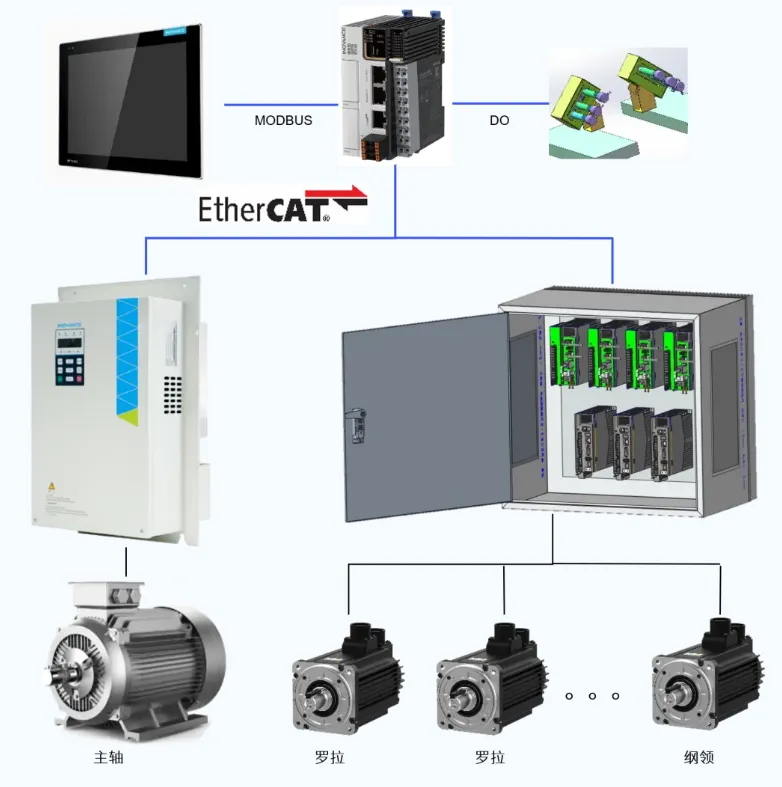 針對(duì)傳統(tǒng)設(shè)備無(wú)法生產(chǎn)高附加值品種的痛點(diǎn),匯川全電方案采用EtherCAT總線方案,通訊速率相比CAN總線方案更快,羅拉速度實(shí)時(shí)可調(diào),響應(yīng)更快,能滿足超短竹節(jié)、段彩等特殊品種工藝要求。